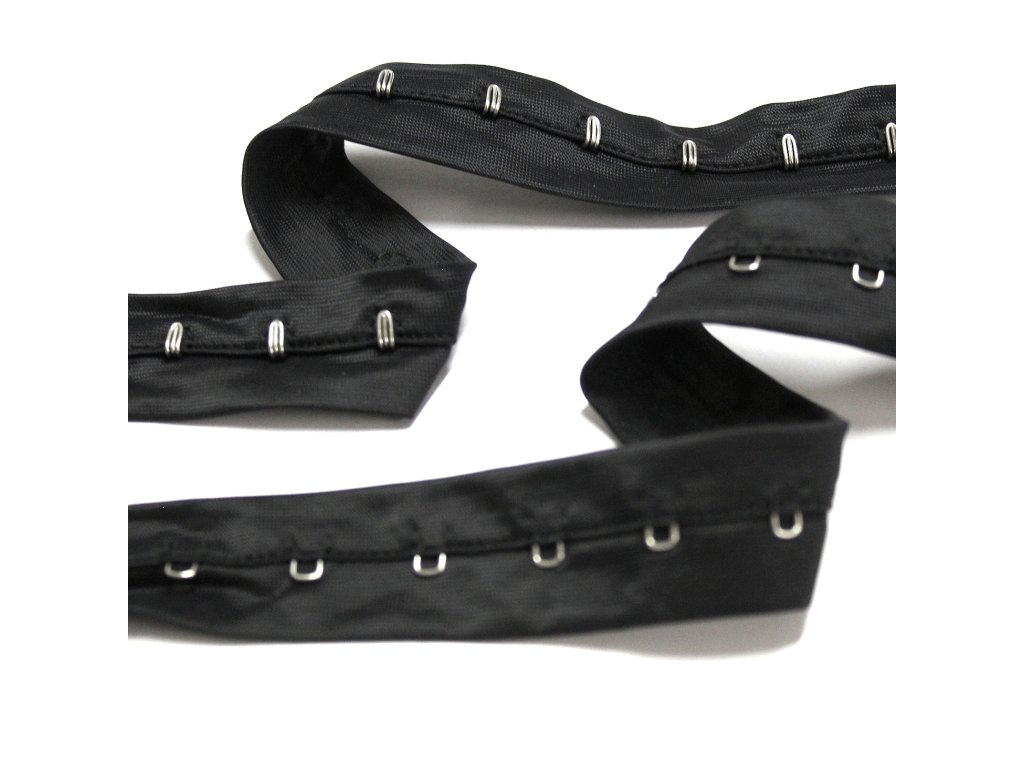 Zapínání háčky a očka našité v metráži na polyesterové stuze, vhodné pro použití jako zapínání u prádla, korzetů, a dalších doplňků a oblečení.