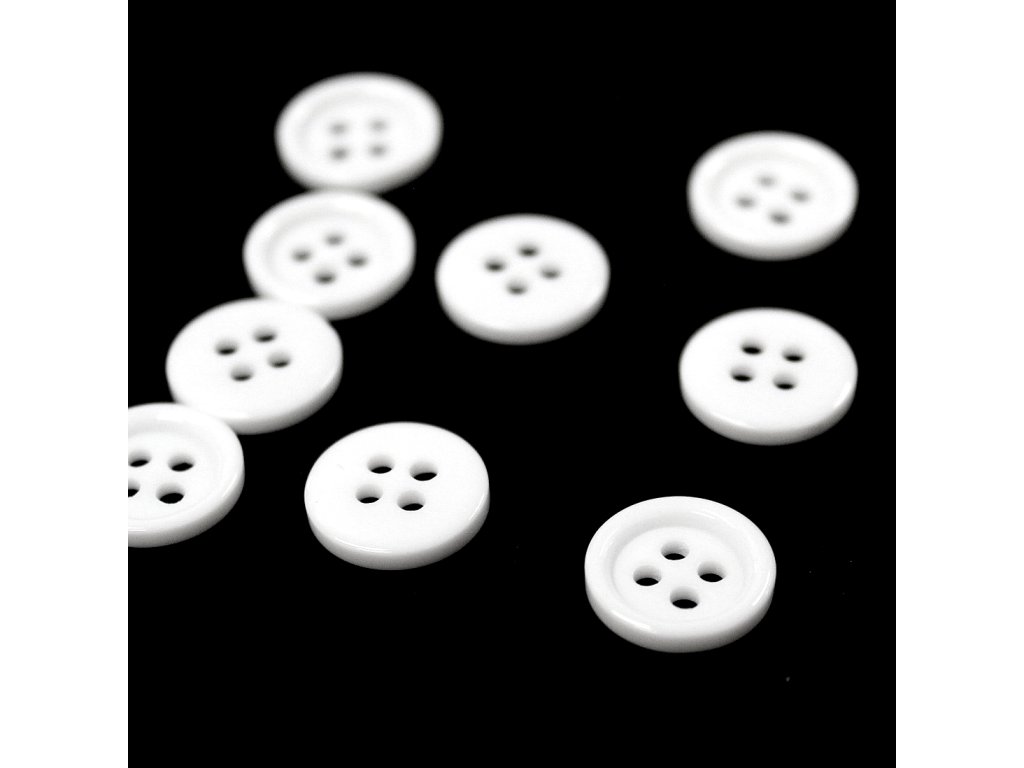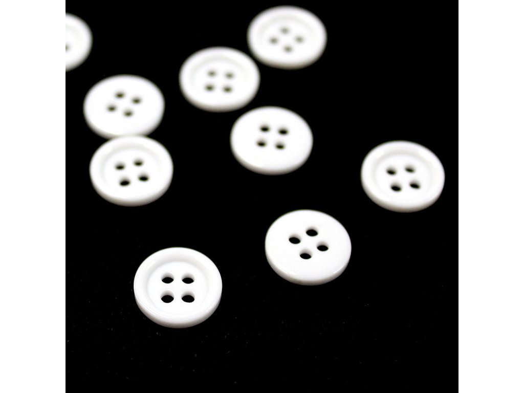 Klasický košilový plastový knoflík s okrajem, čtyřdírkový, mírně lesklý.