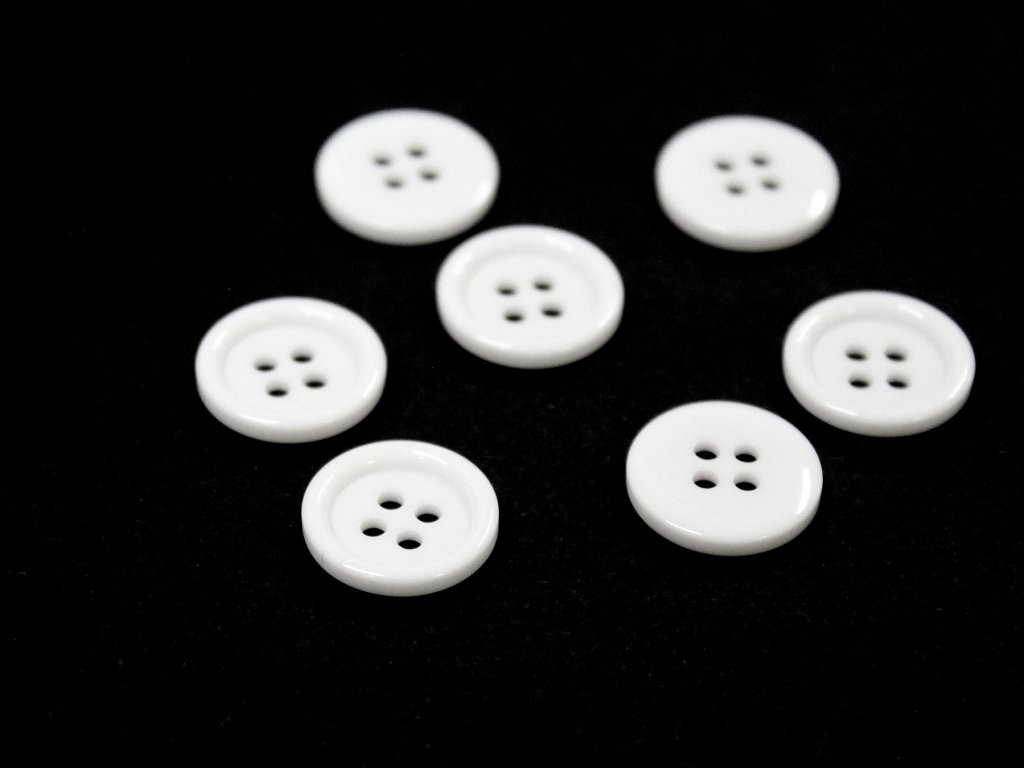 Klasický košilový plastový knoflík s okrajem, čtyřdírkový, lesklý.