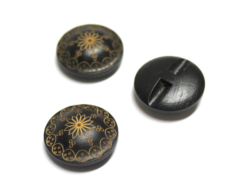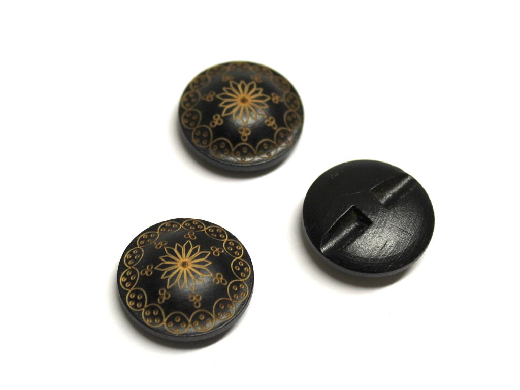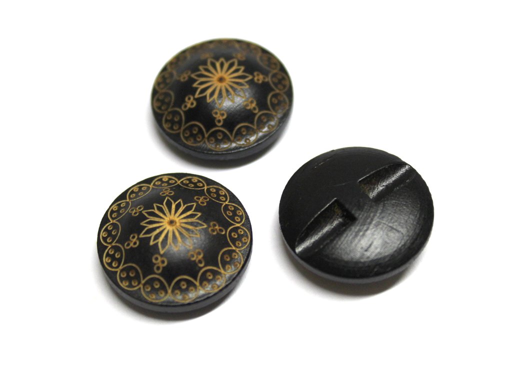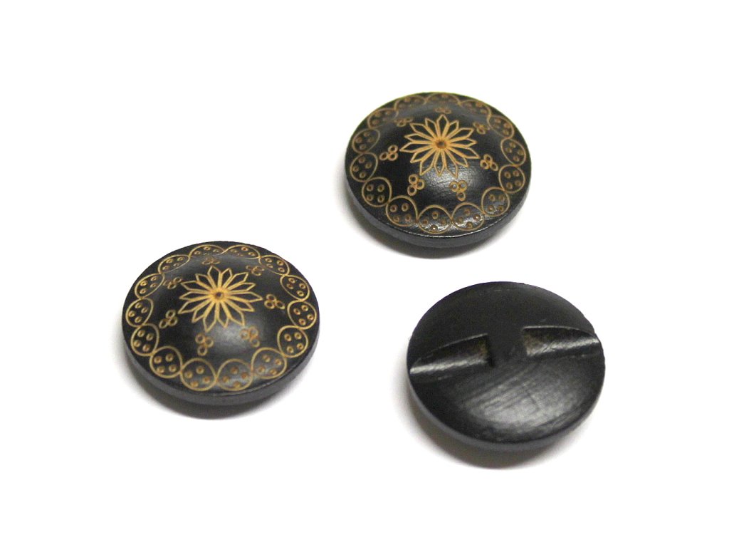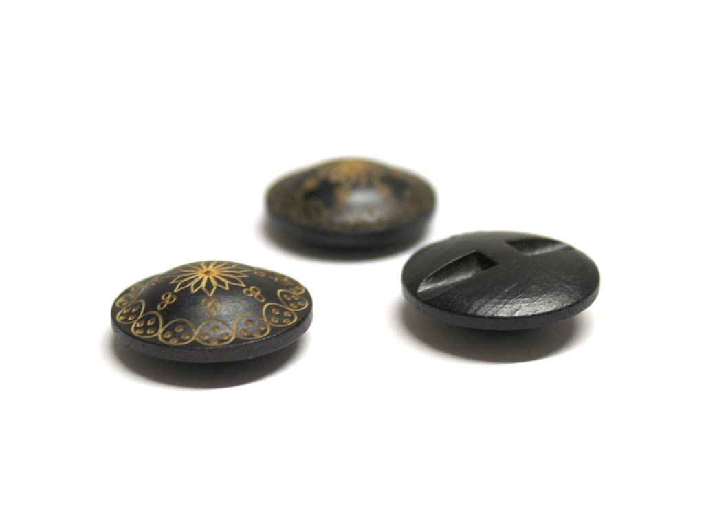 Vypouklý dřevěný knoflík s dekorativním motivem a s dírkou na přišití zespoda.
