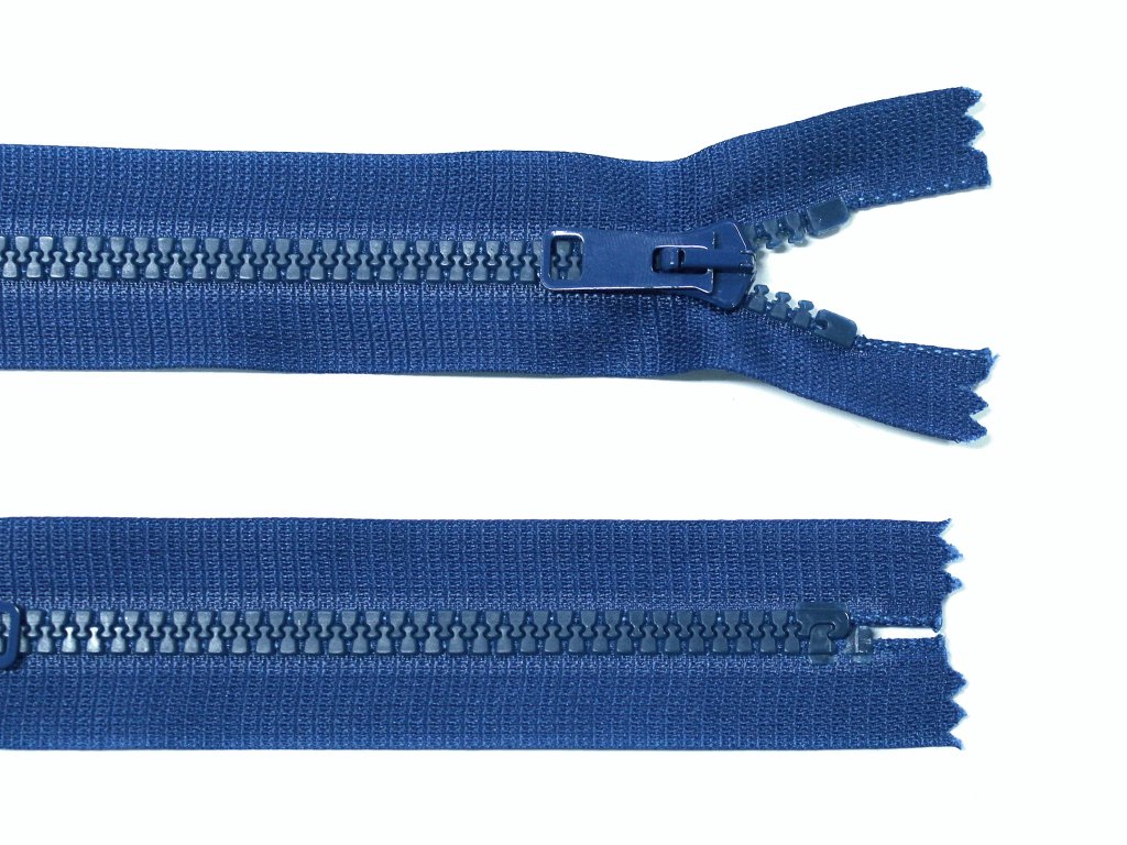 Klasický plastový zip (kostěný), nerozepínací, ve středně modré barvě.