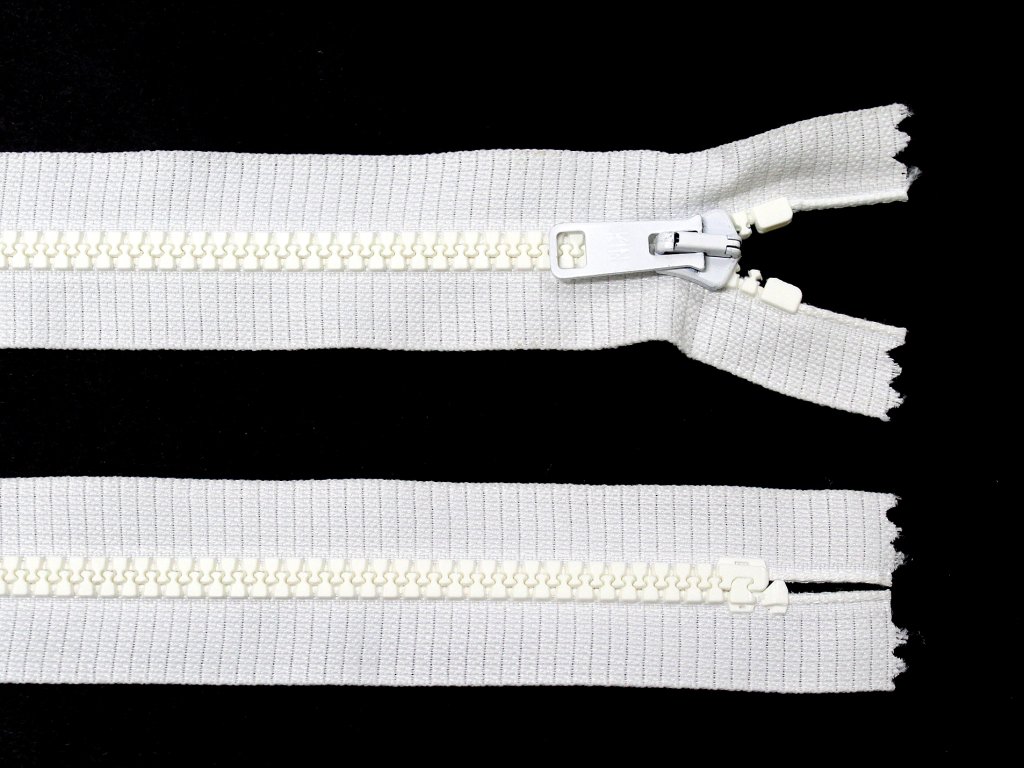 Klasický plastový zip (kostěný), nerozepínací, v bílé barvě.