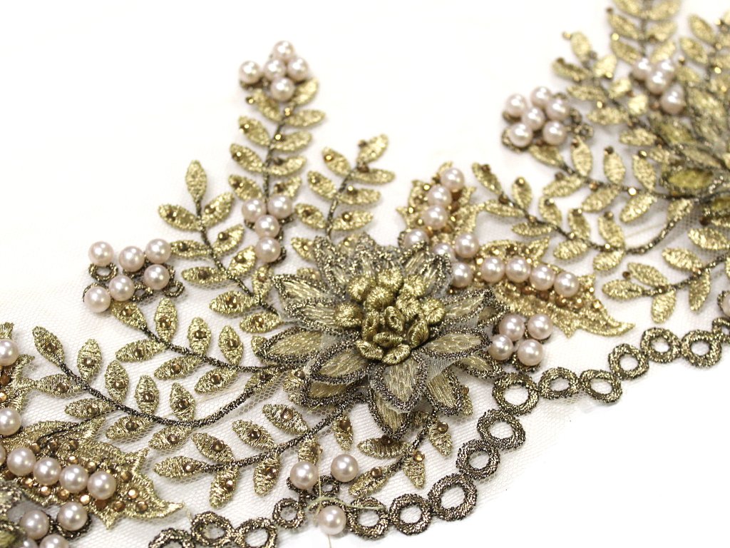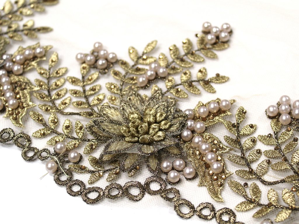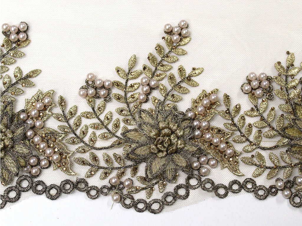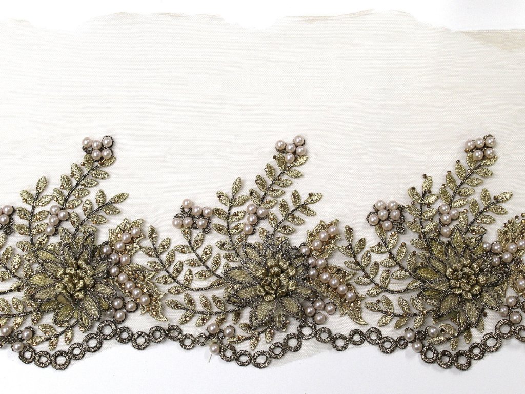 Ozdobná pevná krajka na tylu, s motivy květin, a vyšívaná s perličkami.