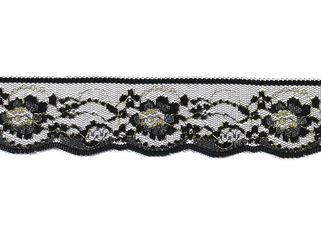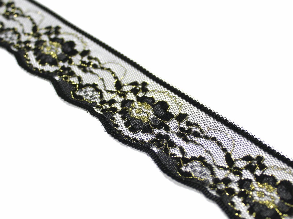 Klasická pevná krajka s motivy květin, v černé barvě se zlatým metalickým vláknem, v šíři 37mm.