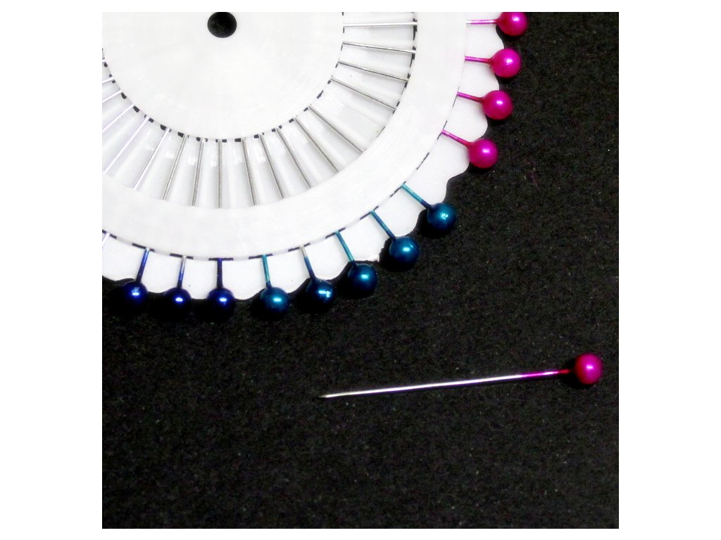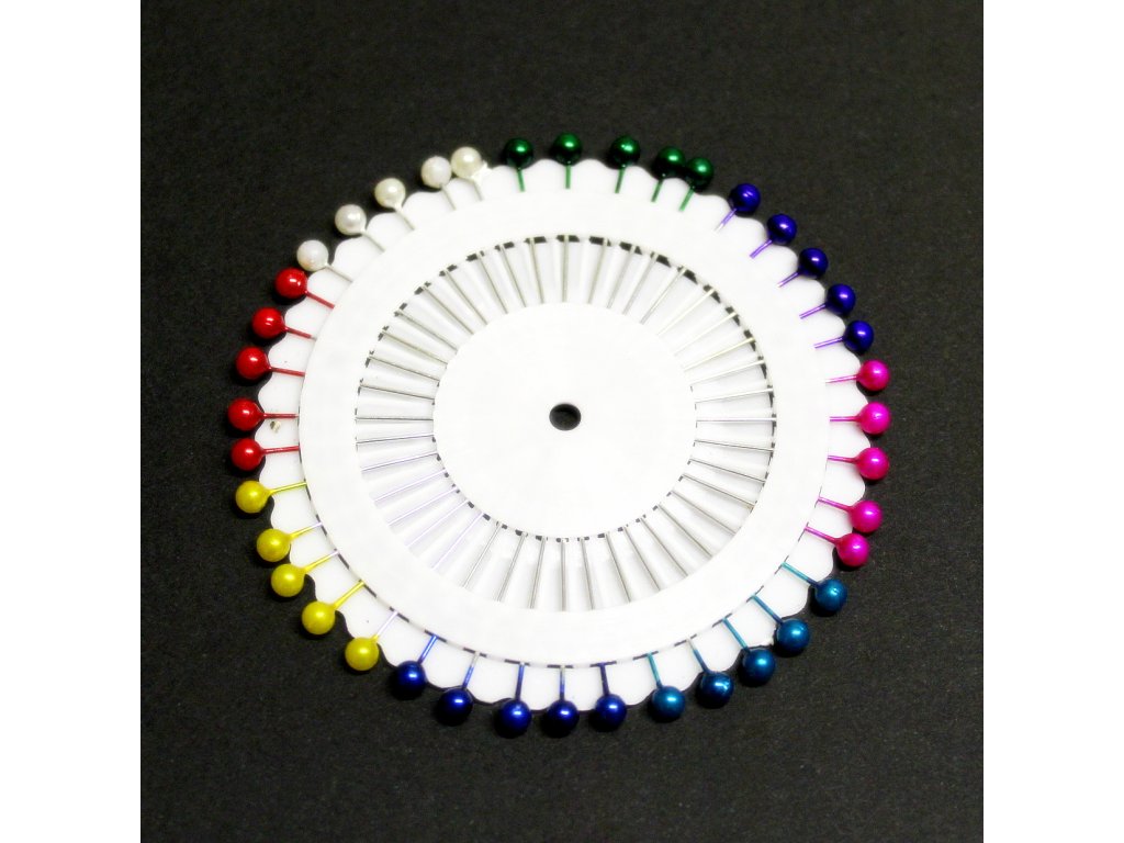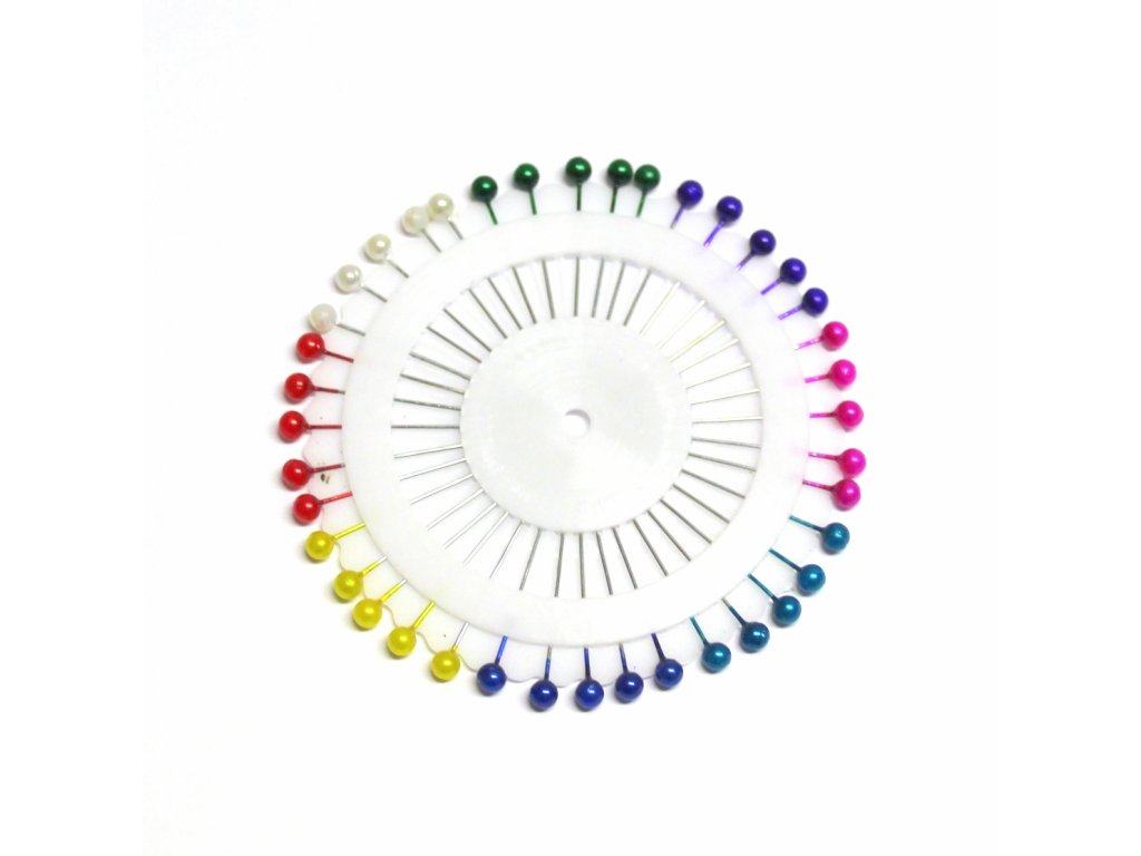 Napichovací špendlík s plastovou perleťovou hlavičkou v různých barvách, na praktickém kolečku.