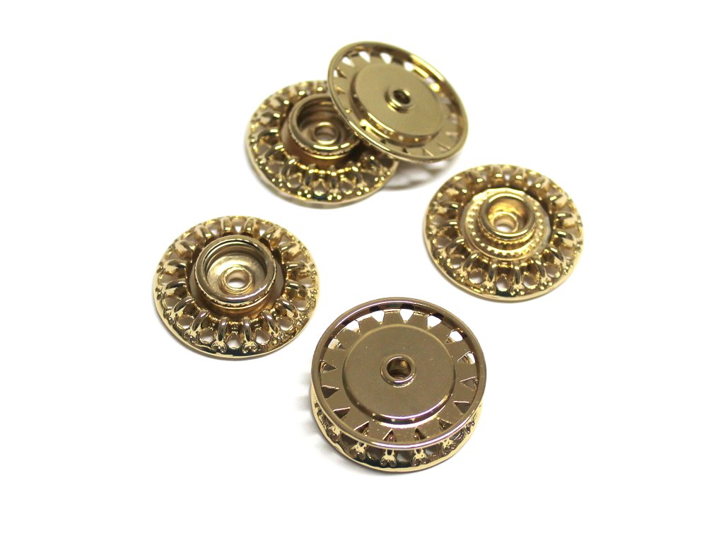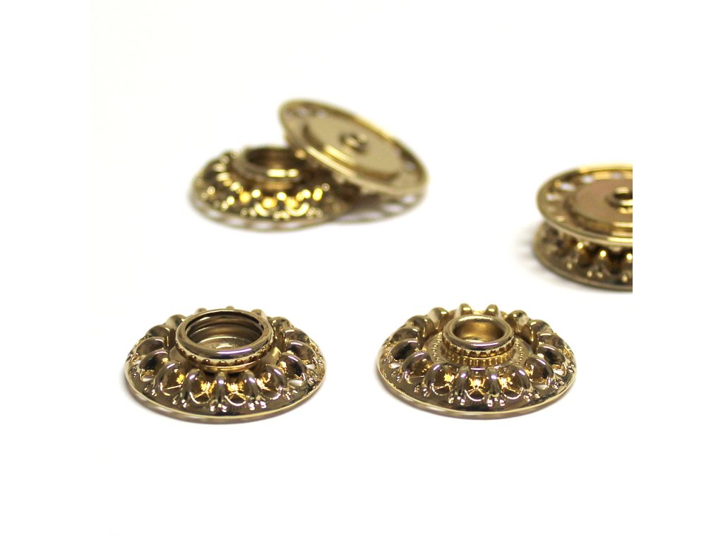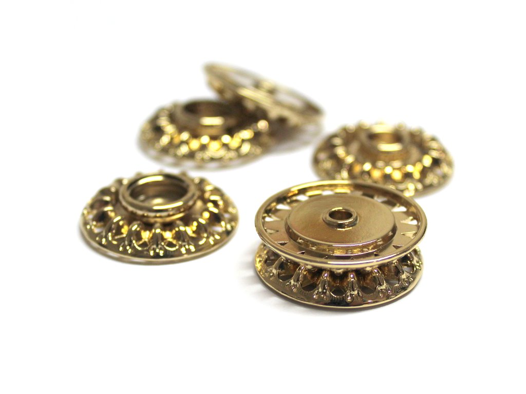 Luxusní ozdobná kovová patentka ve zlaté barvě - stiskací přišívací knoflík, zapínání.