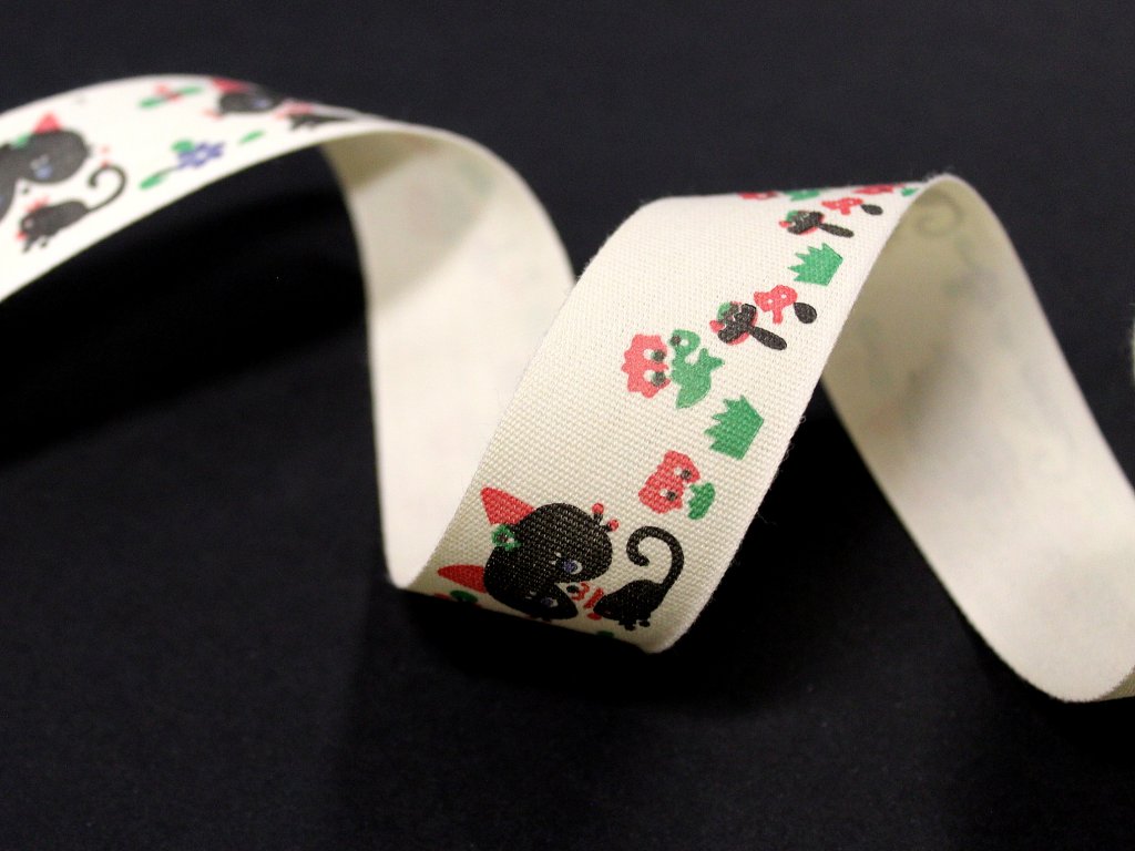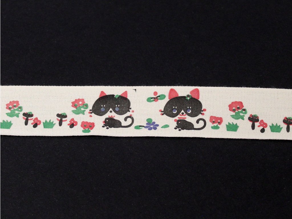Plátnová stuha dekorační s motivem koček a květin na světle béžové plátěné stuze, vhodná na dekorace, dárky, šití a lemování.