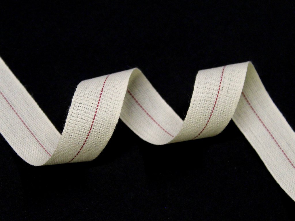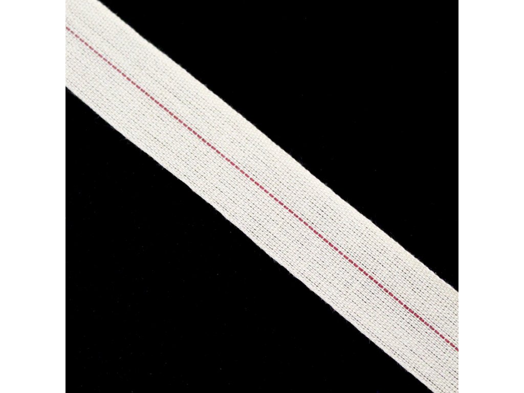 Tenká, jemná bavlněná stuha / tkaloun s plátnovou vazbou - s červeným přerušovaným proužkem uprostřed, pro snadné přeložení v půlce a lemování doplňků a oblečení.