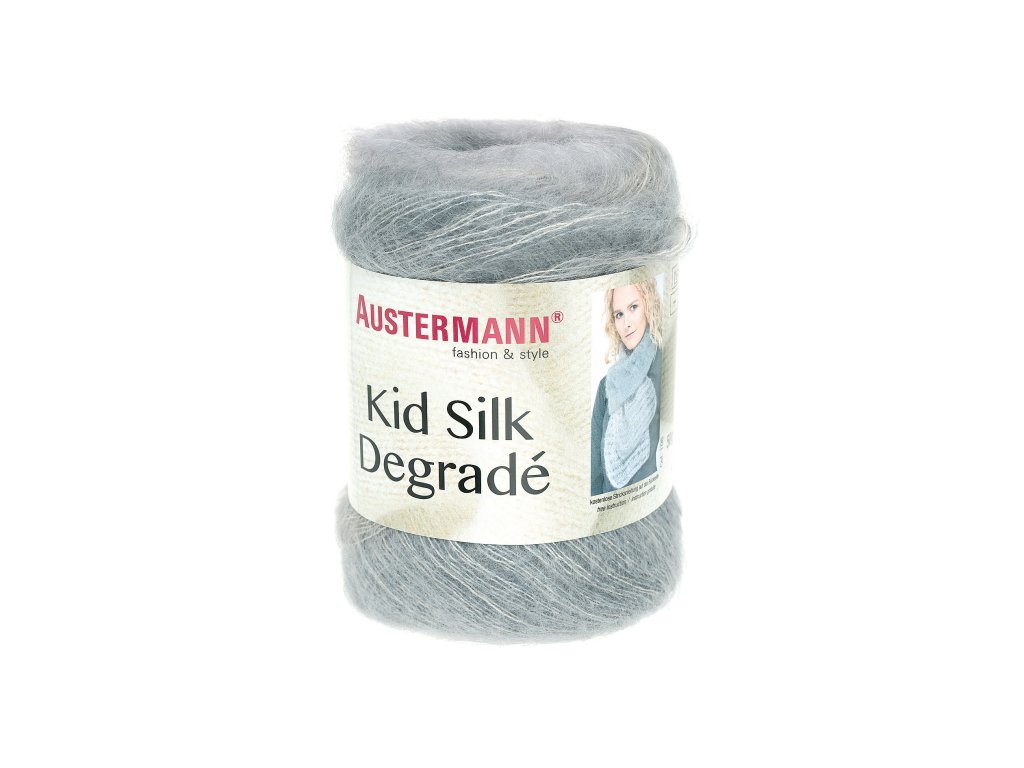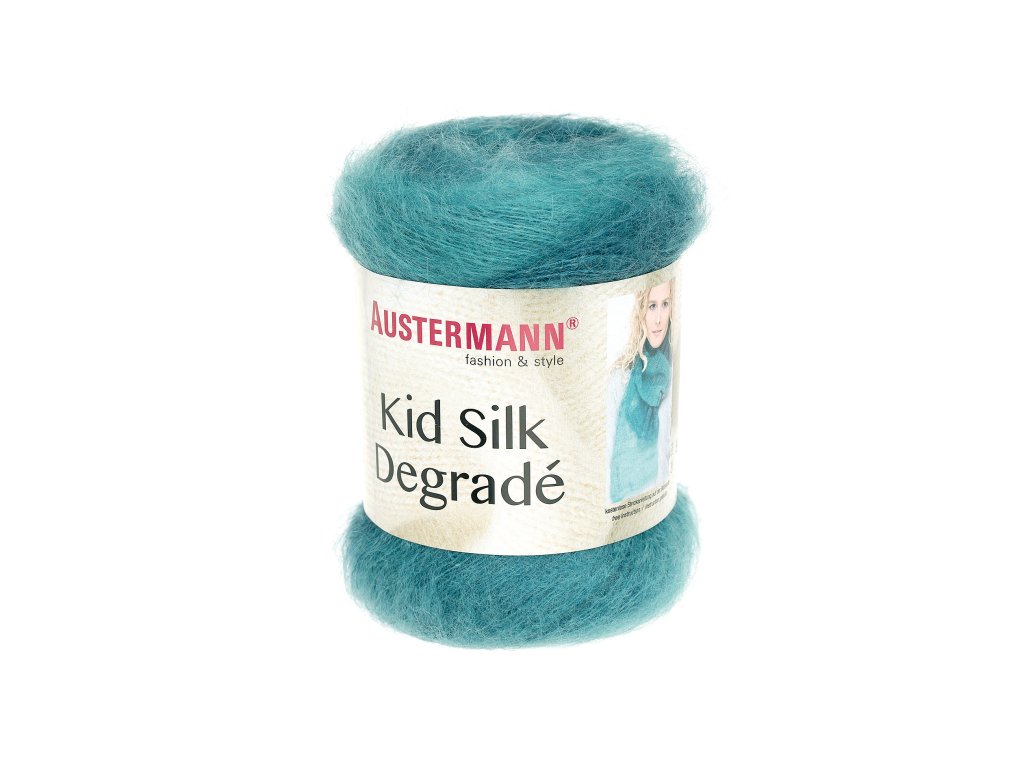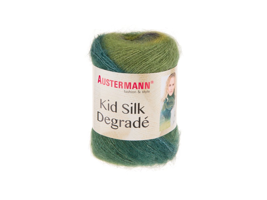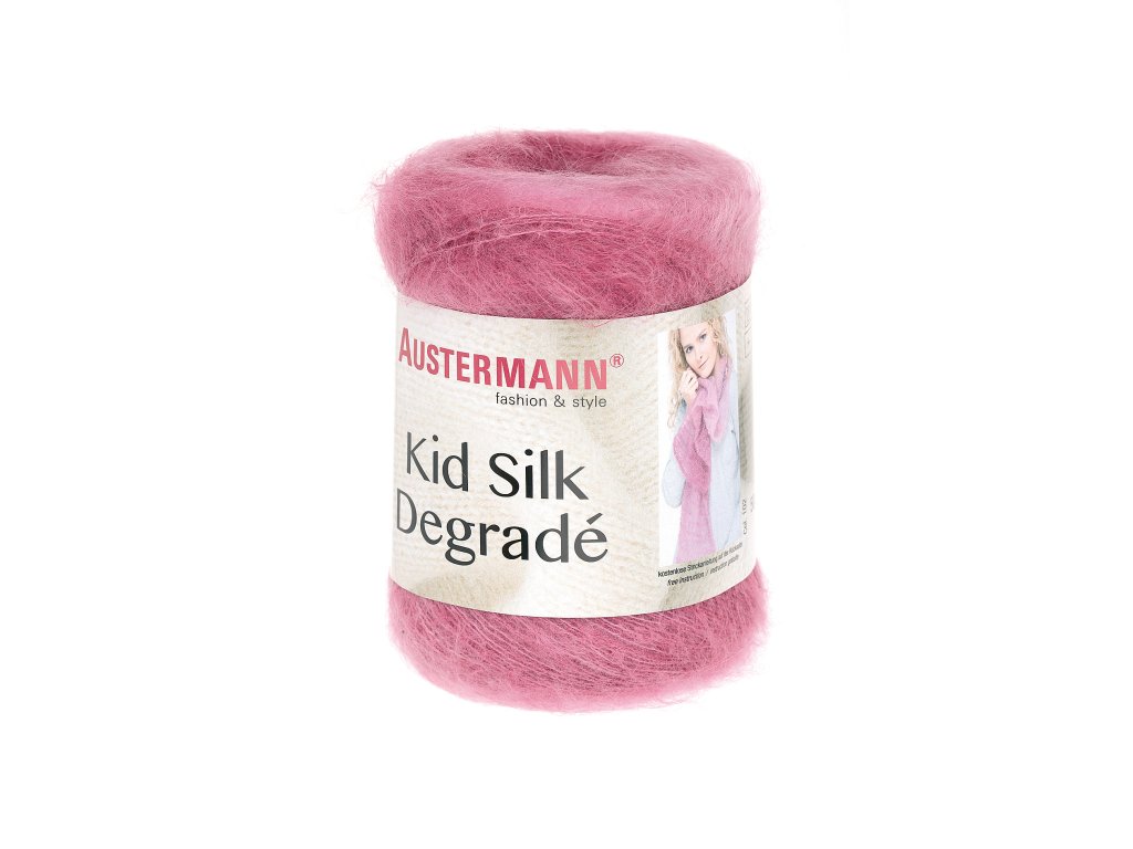 Lehounká a hřejivá ručně pletací příze Kid Silk Degradé s velmi nízkou spotřebou, výrazným chlupem a efektním průběhem barev tón v tónu je kombinací extra jemného Super Kid mohéru a ušlechtilého něžného přírodního hedvábí.