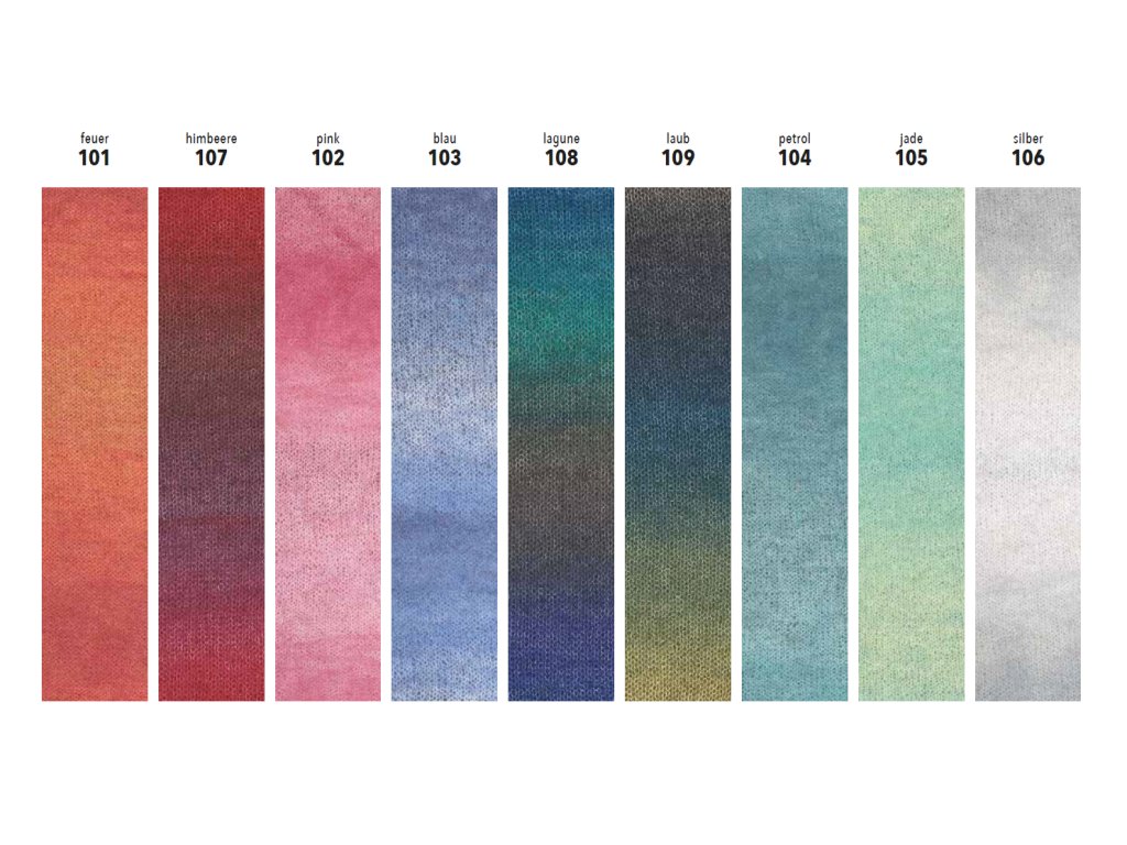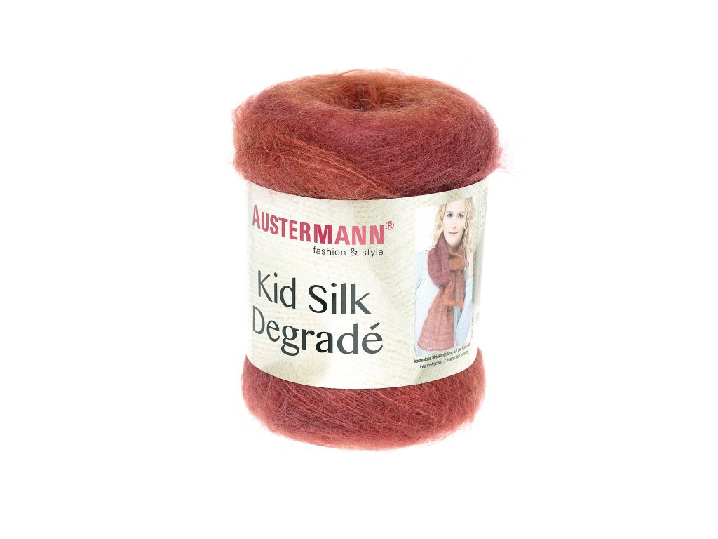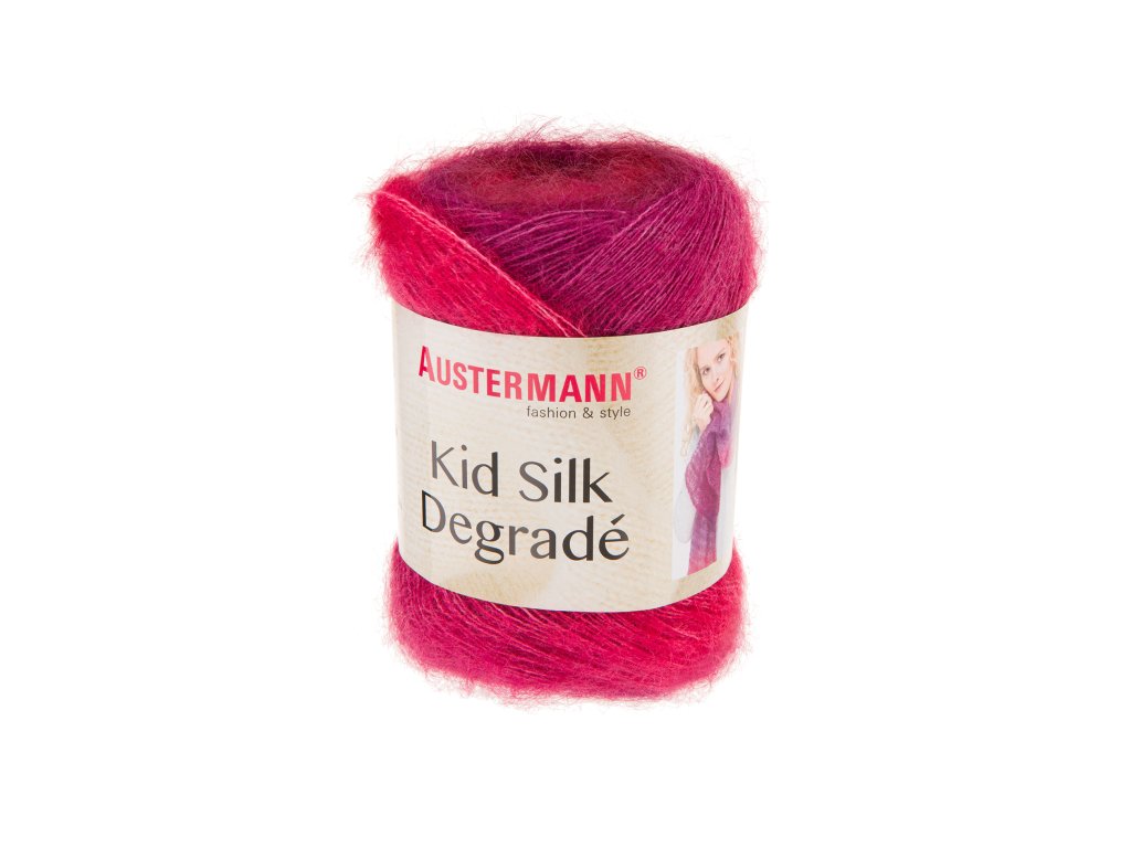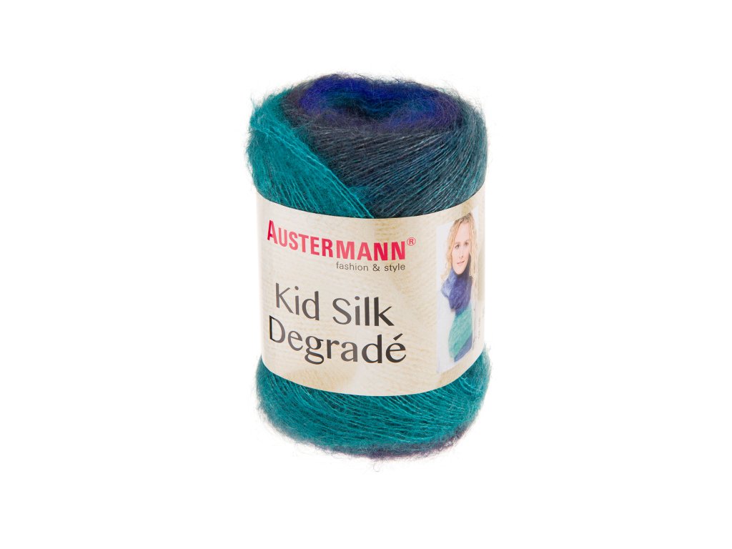 Lehounká a hřejivá ručně pletací příze Kid Silk Degradé s velmi nízkou spotřebou, výrazným chlupem a efektním průběhem barev tón v tónu je kombinací extra jemného Super Kid mohéru a ušlechtilého něžného přírodního hedvábí.