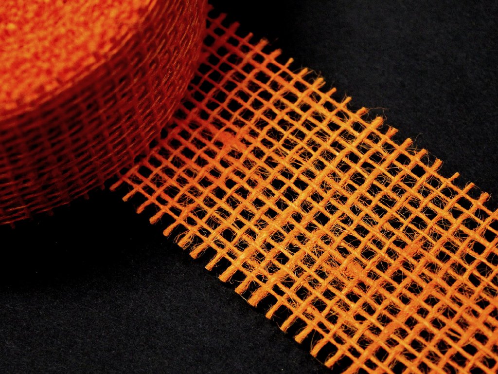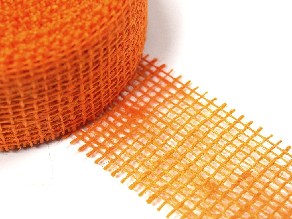 Jutová dekorační stuha, pevná. V sytě oranžové barvě.