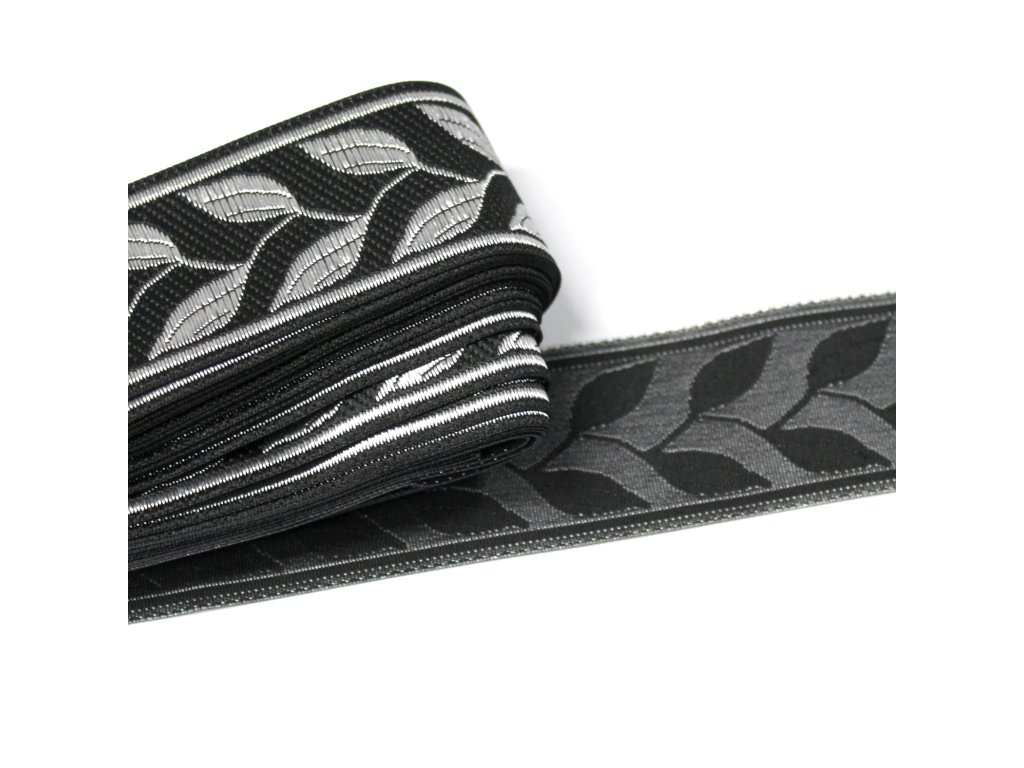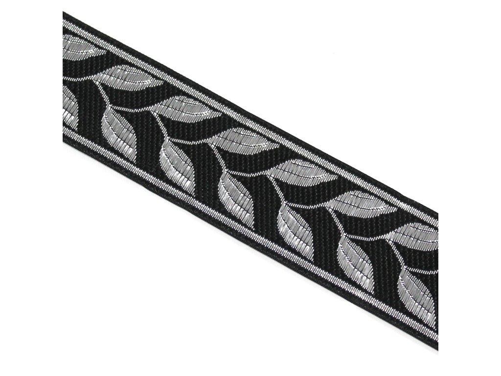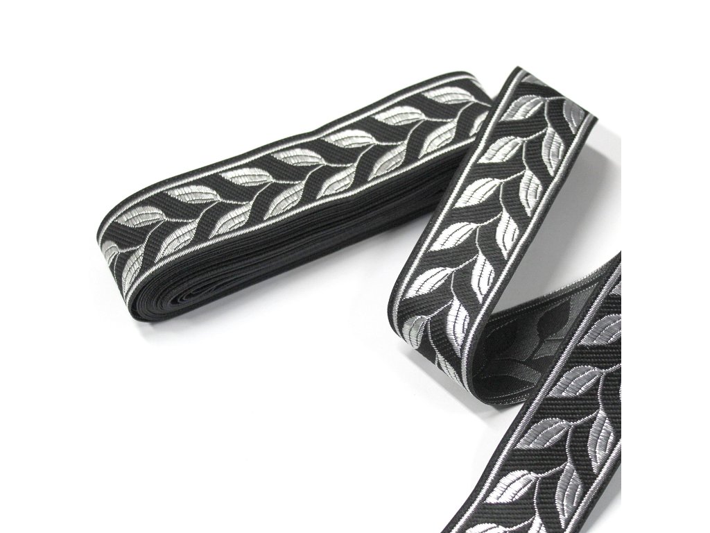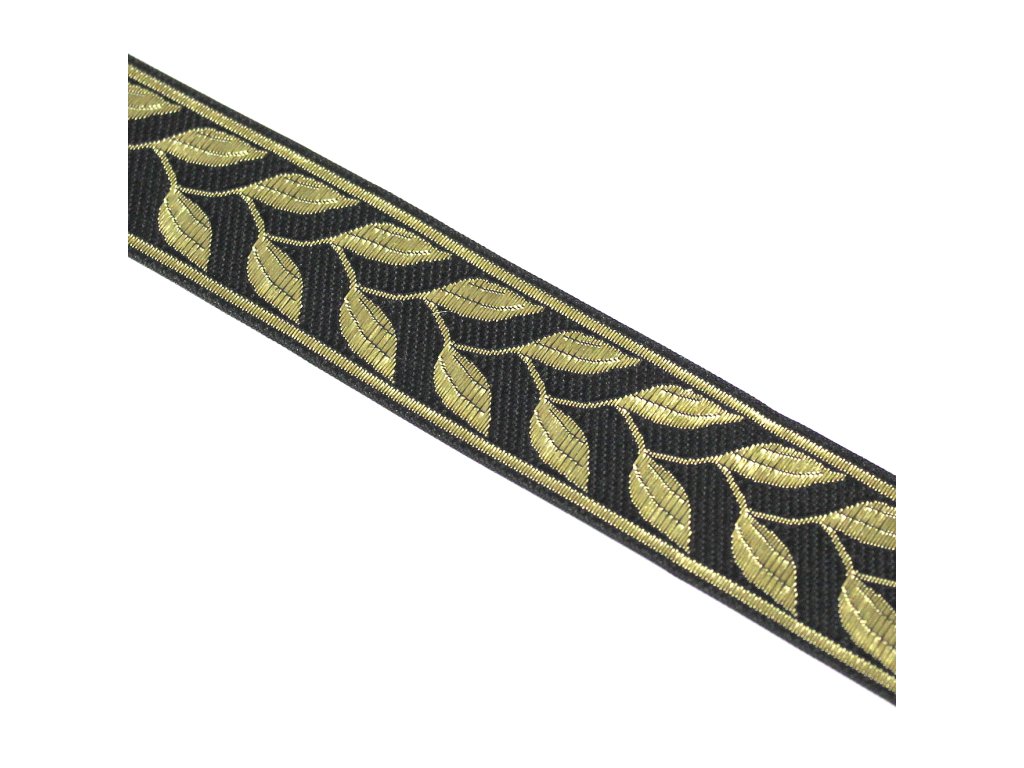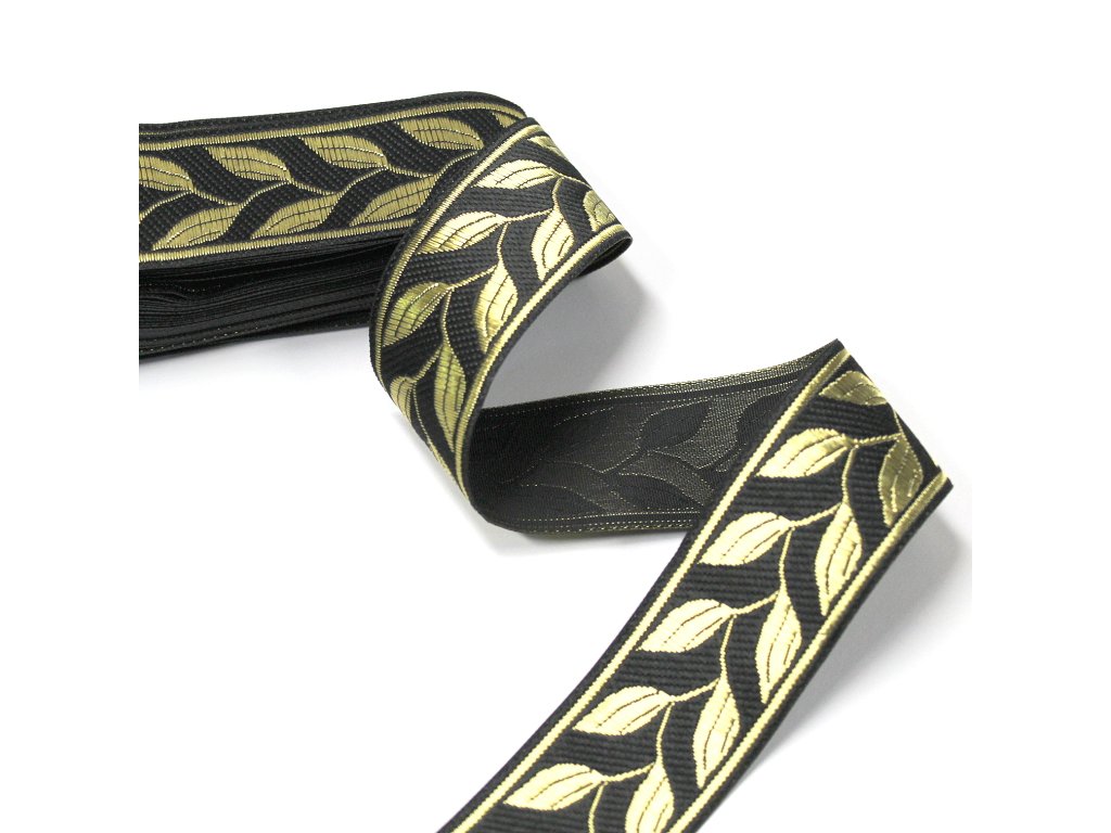 Vyšívaná prýmka s motivem vyšívaných lístků ve zlaté a stříbrné barvě na černém podkladu.
