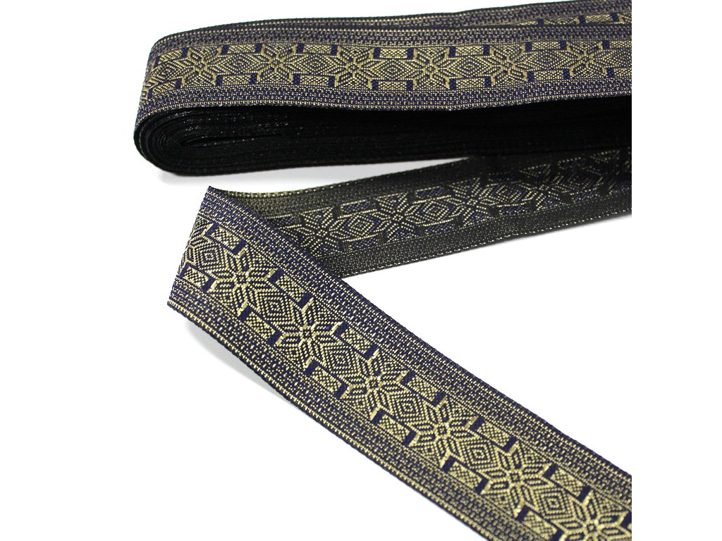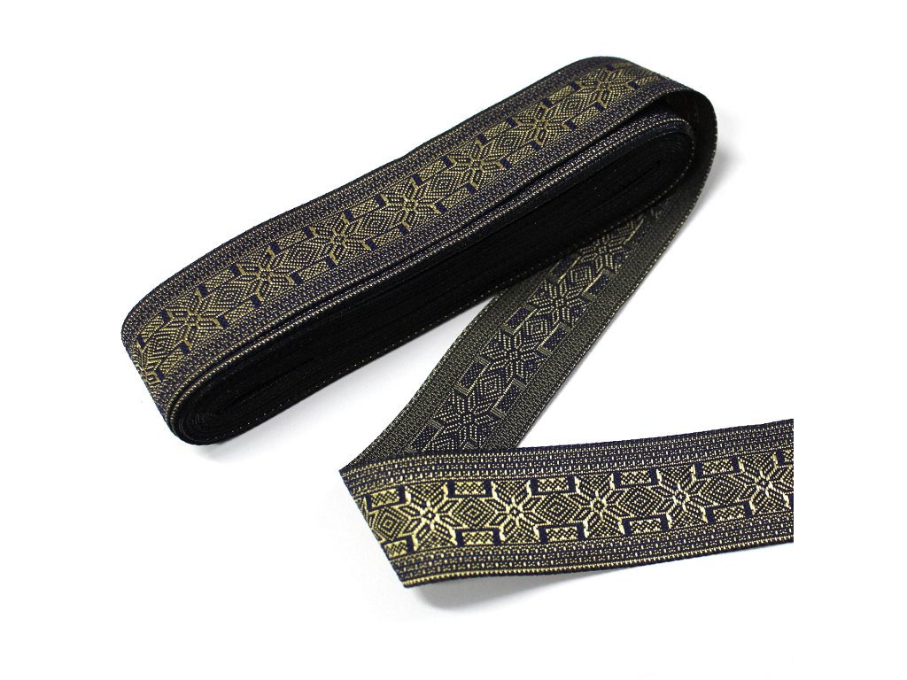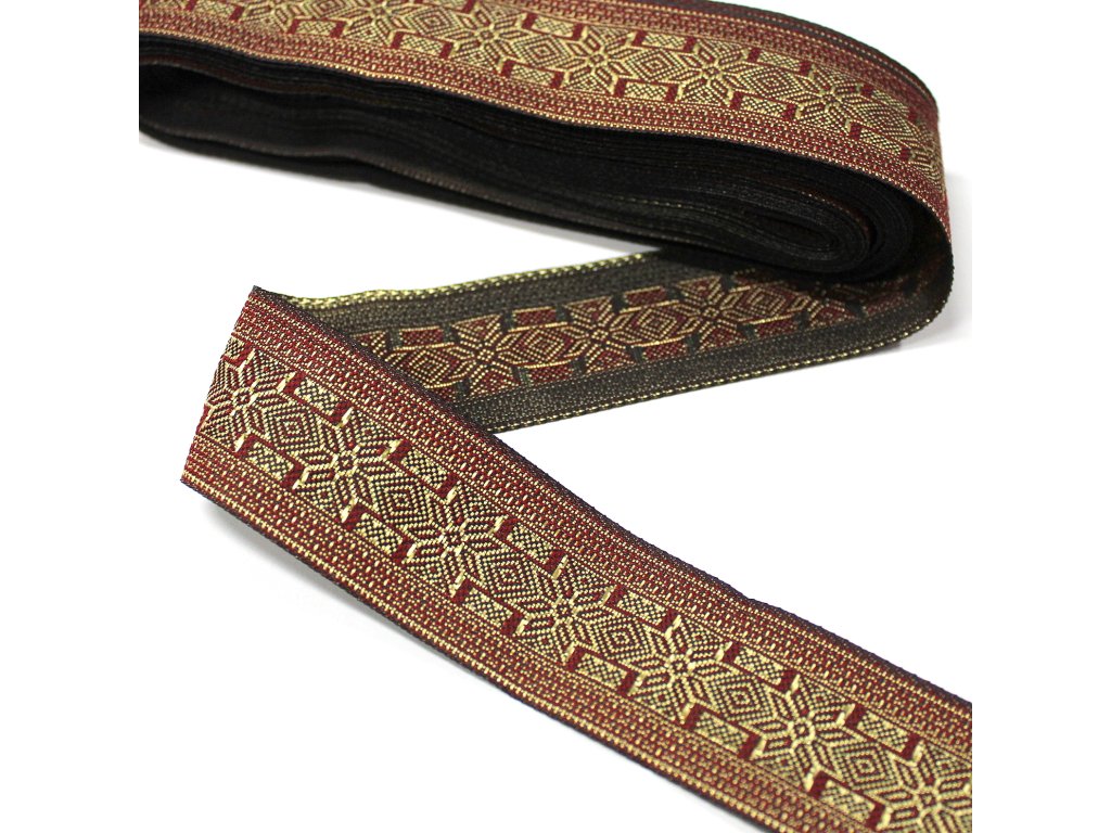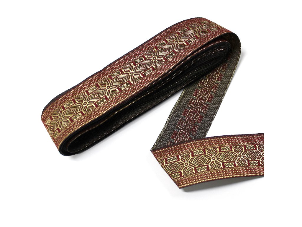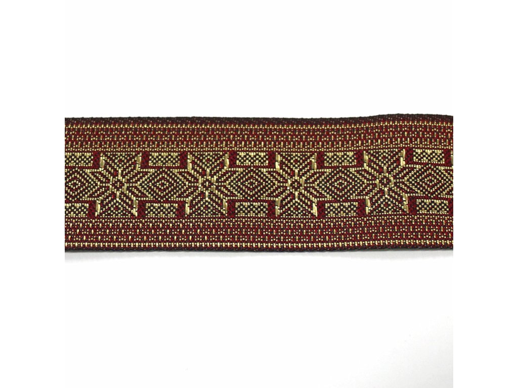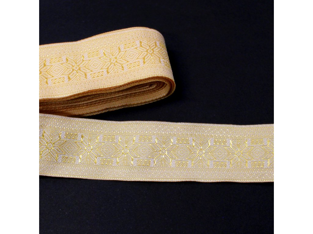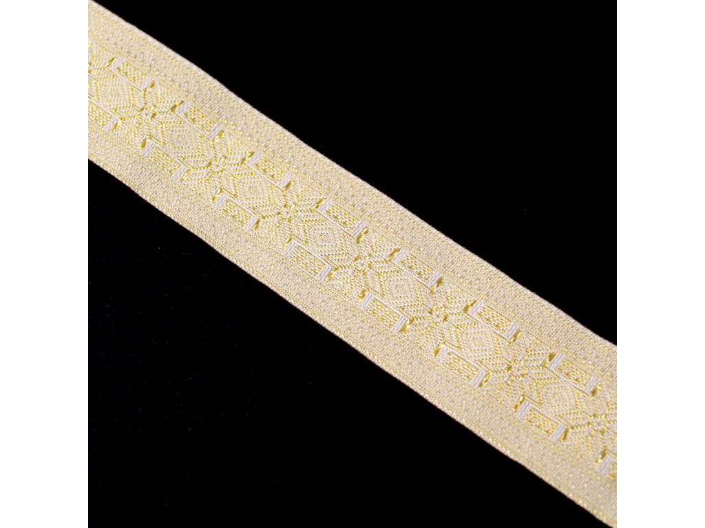 Jemná vyšívaná prýmka s motivem geometrické mozaiky ve zlaté barvě na základní barvě dané prýmky.