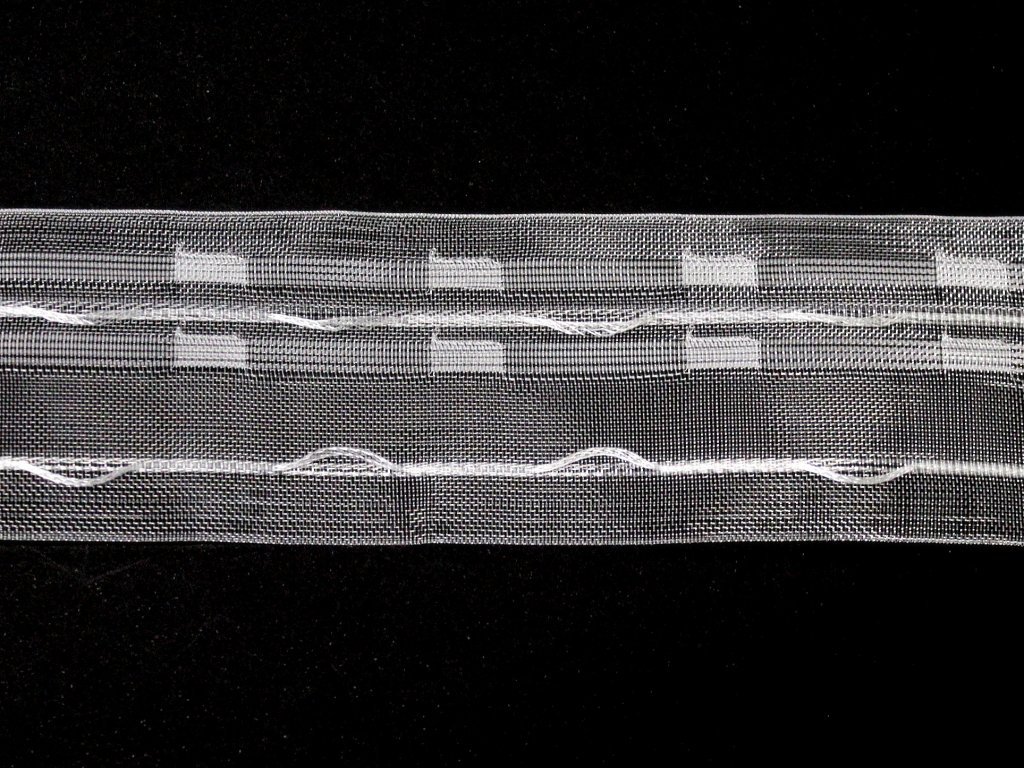 Univerzální a klasická transparentní silonová záclonová stuha s řasením libovolným tužkovým, 1:2, a s kapsičkami na háčky.