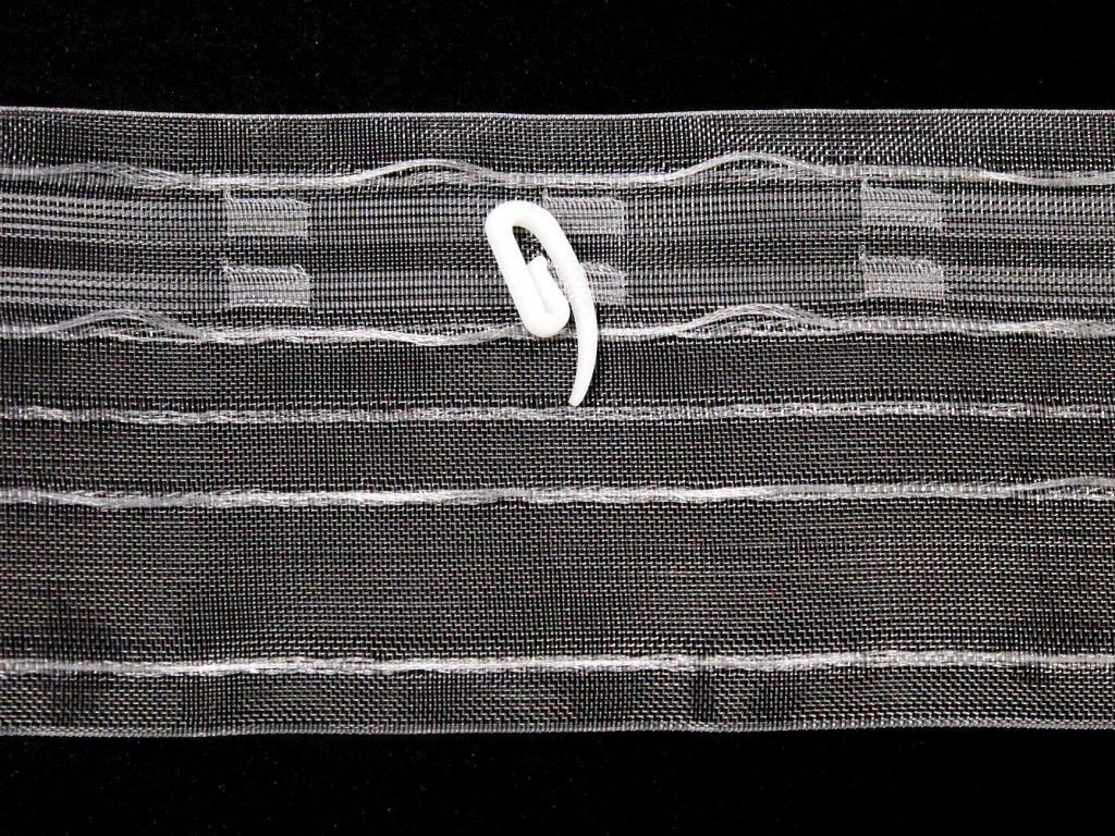 Široká univerzální transparentní silonová záclonová stuha s řasením libovolným tužkovým, 1:2, a s kapsičkami na háčky.